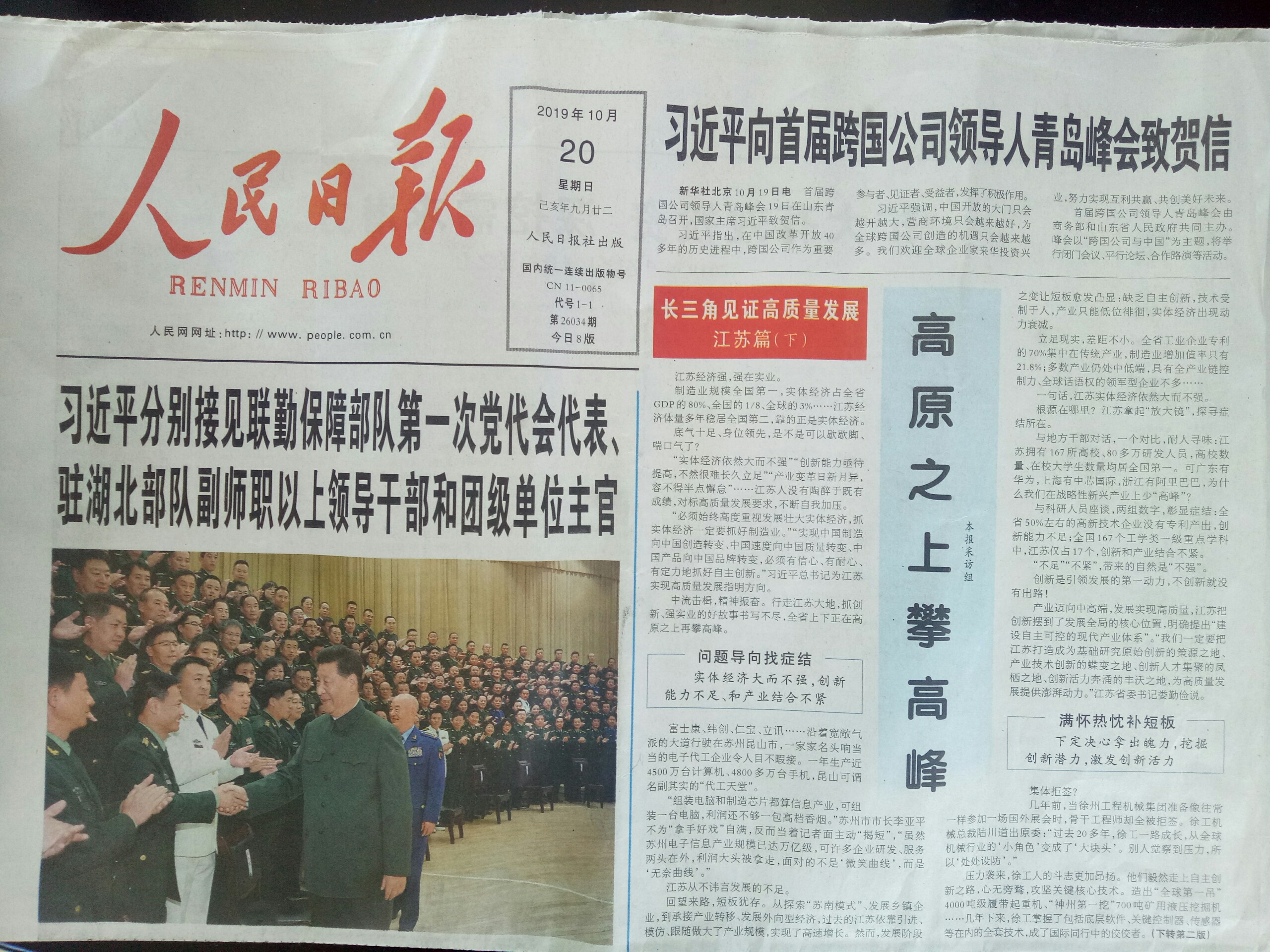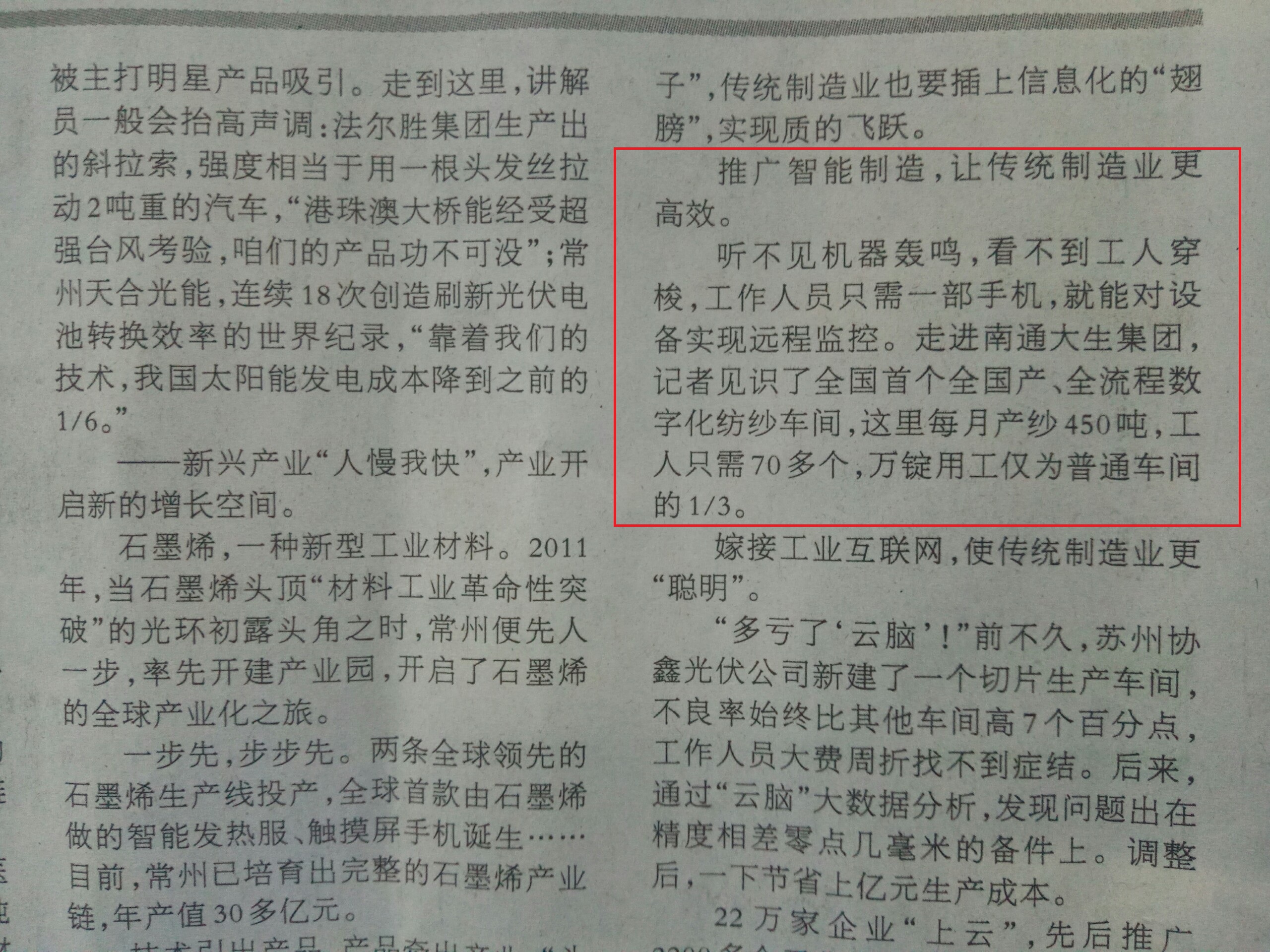 10月20日,《人民日报》头版以《高原之上攀高峰》为题,对江苏制造高质量发展进行重点介绍。其中,在说到“推广智能制造,让传统制造业更高效”时,文中写到:“听不见机器轰鸣,看不到工人穿梭,工作人员只需一部手机,就能对设备实现远程监控。走进南通太阳集团,记者见识了全国首个全国产、全流程数字化纺纱车间,这里每月产纱450吨,工人只需70多个,万锭用工仅为普通车间的1/3。”时隔三个月再次对太阳集团进行介绍和点赞。 9月30日,《新华日报》以《奋进新时代,创造新辉煌》为题,对全省13个地级市各一个重点国有企业高质量发展进行集中报道,集团公司代表南通国企入列“国企方阵”,在国庆前夕集中展示。《民族工业“活标本”,现代纺织新典范》,再次向人们介绍了太阳集团创新创业创优、走向“第二个百年”的生动实践和豪迈激情。近日,美国国际日报和世界日报、法国欧洲时报、加拿大环球华报、意大利侨网、澳洲周刊和澳中网、迪拜新闻网、非洲时报等“海外华文媒体”,也纷纷走进太阳集团。