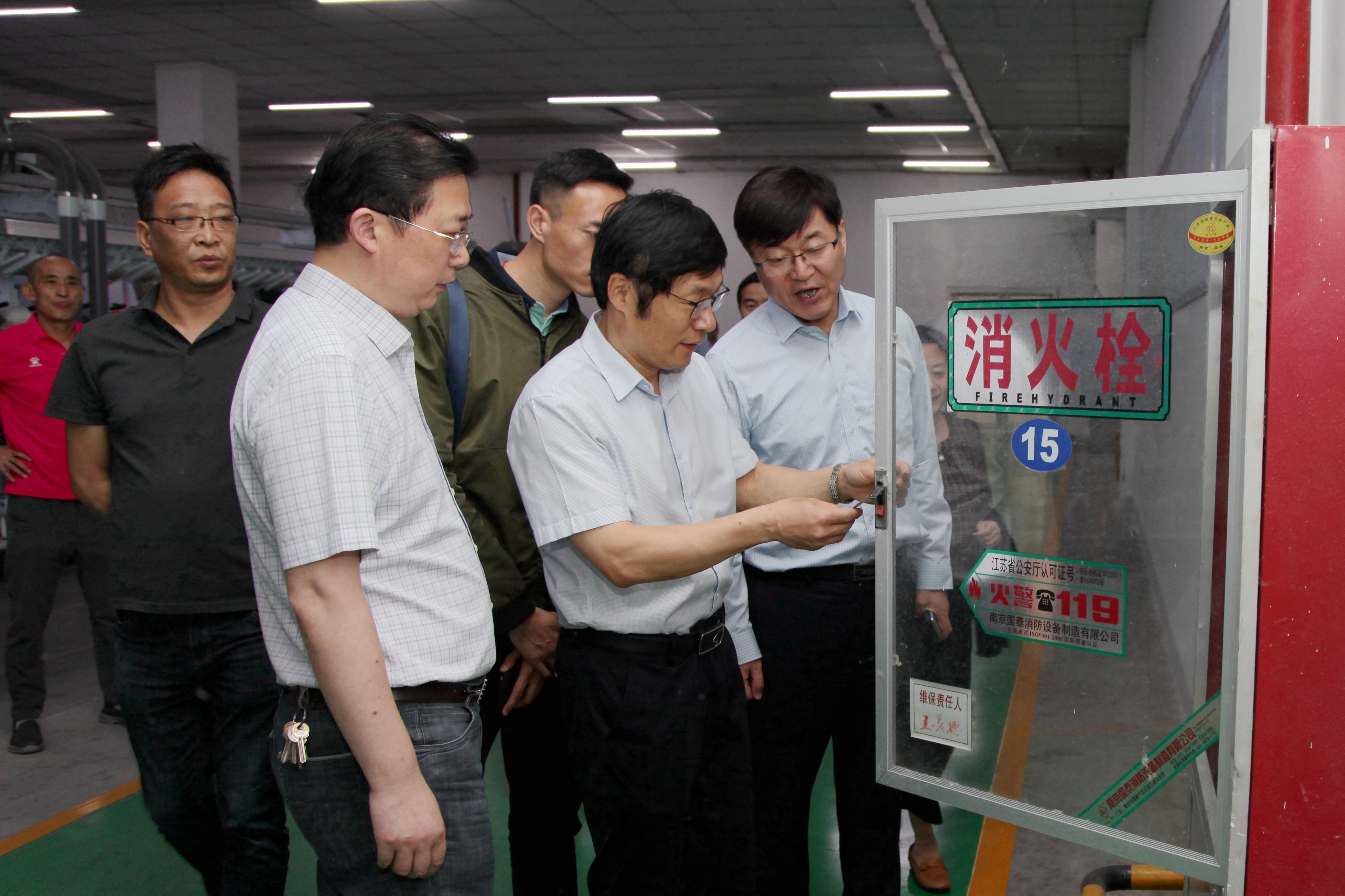 督查组一行首先来到集团公司新区,对新型纺车间、数字化车间等生产现场及危险品仓库、消防通道等重点区域进行检查,然后来到集团本部,重点对钟楼、公事厅、老清花间、老仓库等部位进行消防安全检查。