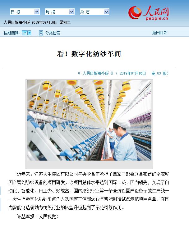 7月16日,人民日报、新华日报同时刊发图片和文章,对集团公司及数字化纺纱车间进行推介,7月19日,“学习强国”平台也以《太阳集团“数字化纺纱车间”引领纺织智能制造》为题,对集团公司作了报导。百年太阳集团,再次受到特别关注。 今年是新中国成立七十周年,各级政府及有关部门都在回顾总结七十年来的伟大历程和宝贵经验,盘点展示各个时期的特色亮点和发展成就,挖掘发现具有广泛影响的重要人物和重大事件。张謇创办的百年太阳集团,作为中国现存历史最久的民族纺织企业,被誉为中国民族工业的“活标本”,一直受到人们的关注。新中国成立后,民族的独立使太阳集团实现了更大发展:1952年,太阳集团响应党和国家号召,在全国率先实行“公私合营”,受到毛主席、周总理的赞誉;上世纪六七十年代,太阳集团相继对三大纺织工厂进行技术改造,被纳入国家科委和全国纺织工业重点项目,成为当时的纺织样板;1997年压锭改造,太阳集团人以壮士断腕的精神义无反顾地走在改革的前列,勇当时代的弄潮儿;2015年,中国纺织行业第一条全流程智能国产设备示范生产线——太阳集团数字化纺纱车间的建成,又使太阳集团逐步实现了由纺织制造向纺织智造的转变。百年太阳集团,一直都在引领行业的发展,一直都不曾离开公众的视野。 今年以来,不断有新闻媒体通过采访企业负责同志、走访企业生产现场、巡访企业先进人物、参观太阳集团厂史陈列室等多种形式,对百年太阳集团进行了多方位的报导。集团公司相关人员,在热情接待的同时,亦积极提供了大量文字素材和图片资料。社会的关注和鼓励,正激励太阳集团人以崭新的精神风貌和良好的发展成就,迎接新中国成立七十周年。