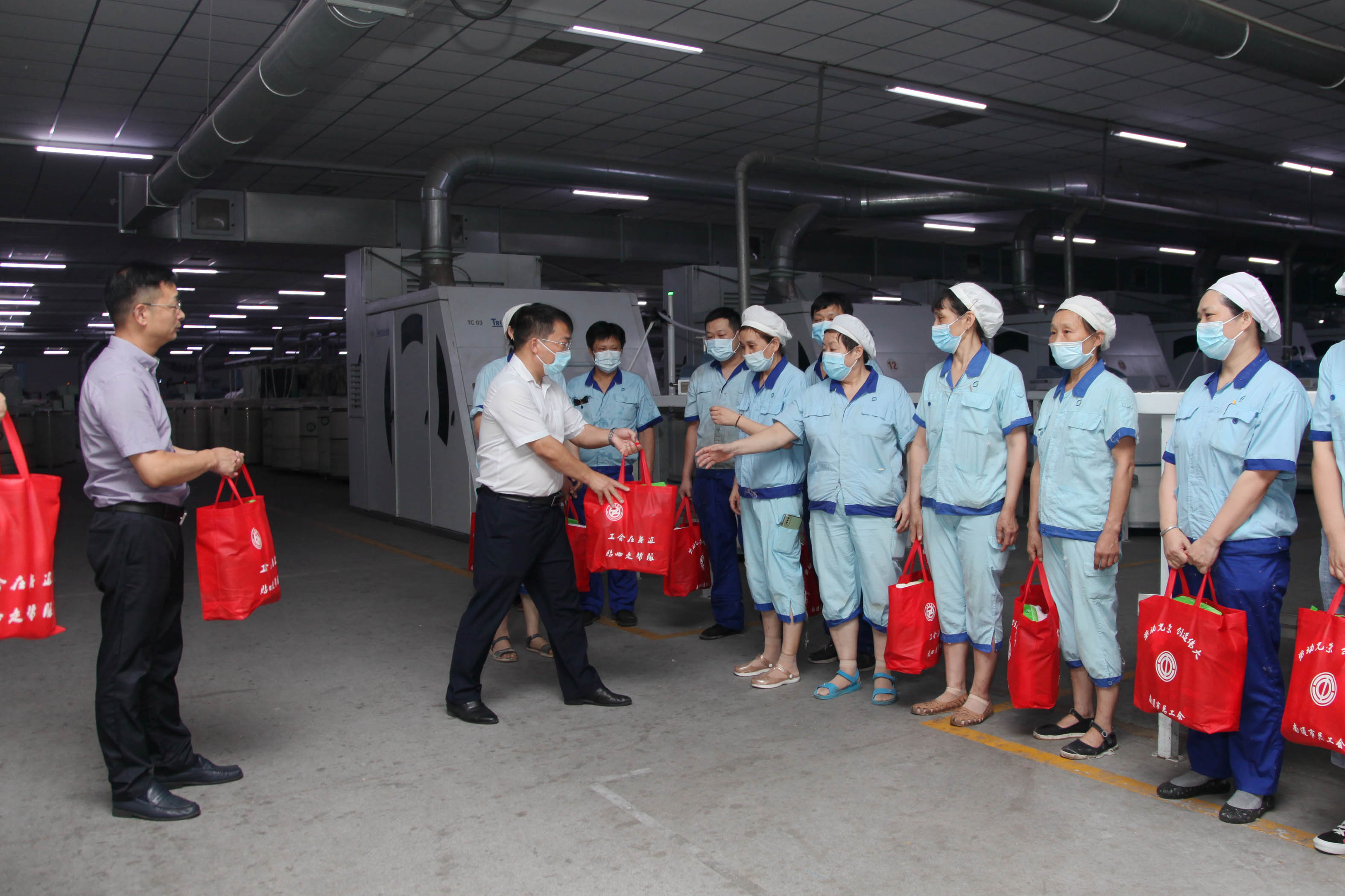 8月11日下午,烈日炎炎,骄阳似火,市总工会党组成员、副主席成飞带领机关工作人员一行来集团公司紧密纺车间走访慰问高温下坚守生产一线的员工,给员工送来夏日清凉和工会关怀。集团公司党委副书记、工会主席张启祥陪同慰问。 张启祥简要介绍公司生产经营概况,疫情防控和防暑降温措施落实情况,集团公司工会向车间一线员工送清凉活动情况。在紧密纺车间生产现场,成飞副主席一行对现场员工进行慰问。成飞与员工亲切握手,将一份份防暑降温物品送到员工手上。他感谢员工不辞辛劳、不畏高温,为保障企业生产、促进南通经济发展辛勤付出。他叮嘱大家在安全作业的同时要做好疫情防控,注意身体健康。他要求公司把疫情防控和关心员工健康放在首位,采取有效措施,为员工创造良好的工作生活环境,确保高温一线员工舒心工作、平安度夏。