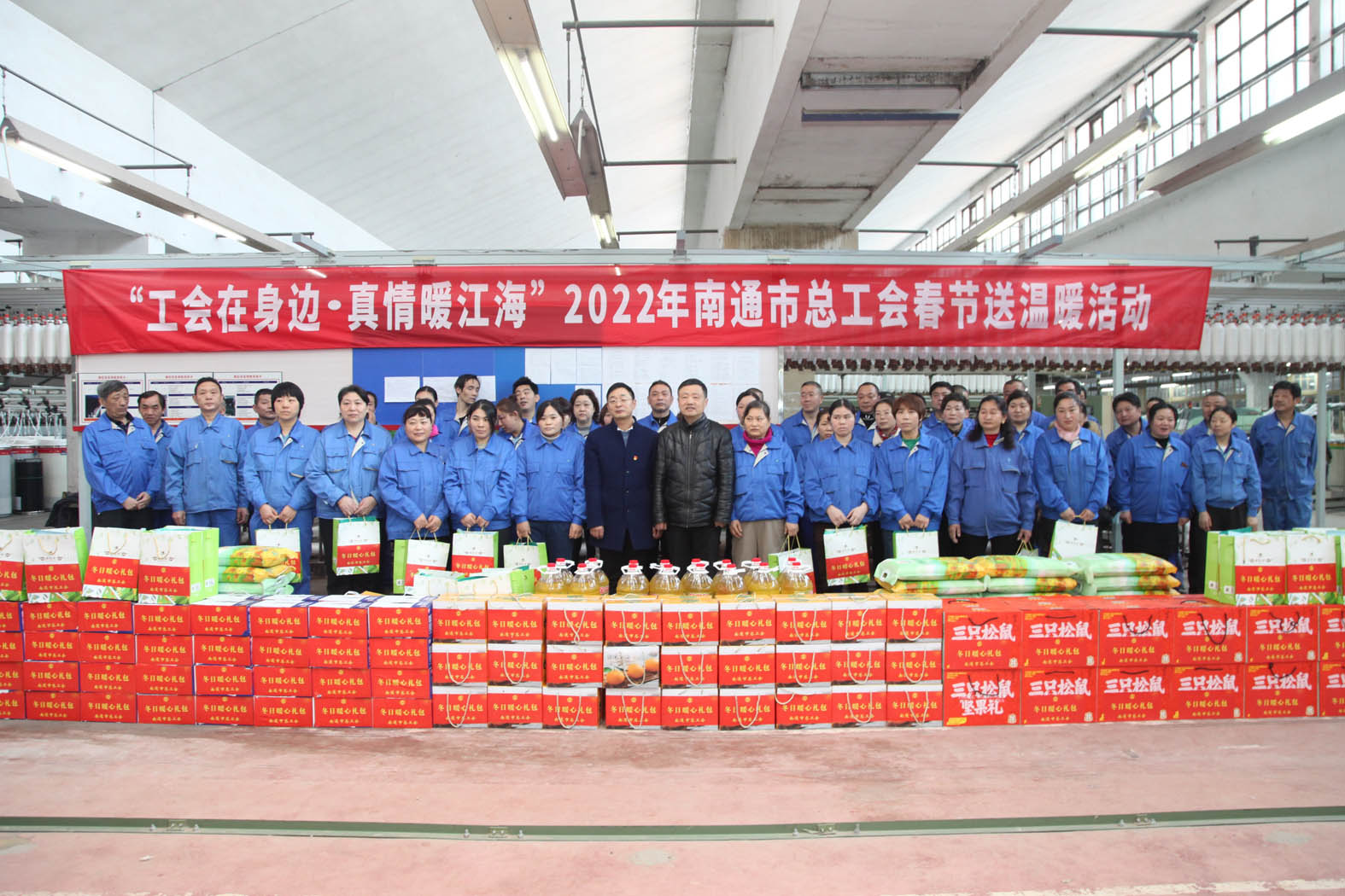 1月21日,市总工会二级调研员陈志祥一行来到集团公司,慰问春节期间坚守工作岗位的一线员工。集团公司党委副书记、工会主席张启祥陪同慰问。 张启祥向陈志祥一行介绍了集团公司生产经营概况和集团工会春节前向困难员工送温暖活动的开展情况。在纺一车间慰问现场,陈志祥说,市总工会开展“工会在身边•真情暖江海”2022年春节送温暖活动,是响应市委市政府保障改善民生工作部署的具体体现,更是做优“工会在身边”服务品牌、提高职工群众获得感幸福感的实事工程。在当前严峻的疫情形势下,太阳集团员工为南通社会经济的发展和百年太阳集团的改革建设作出了显著贡献,他代表市总工会,向春节期间坚守工作岗位的全体太阳集团员工表示感谢,祝大家度过一个欢乐、祥和、健康的春节。陈志祥与现场一线员工代表亲切握手,送上特产礼包等慰问品,并与大家合影留念。