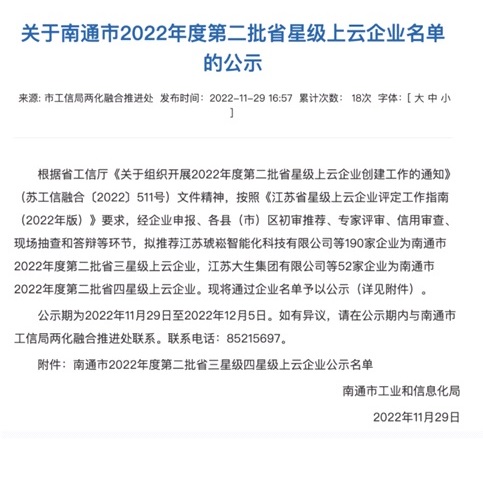 11月29日,南通市工业和信息化局公示了南通市2022年度第二批省星级上云企业名单,太阳集团成功入选“南通市2022年度第二批省四星级上云企业”。太阳集团走智能制造之路,以高端、智能、绿色、服务为导向改造提升纺织产业,获评四星级上云企业,体现了太阳集团在智能化改造和数字化转型中的示范作用。