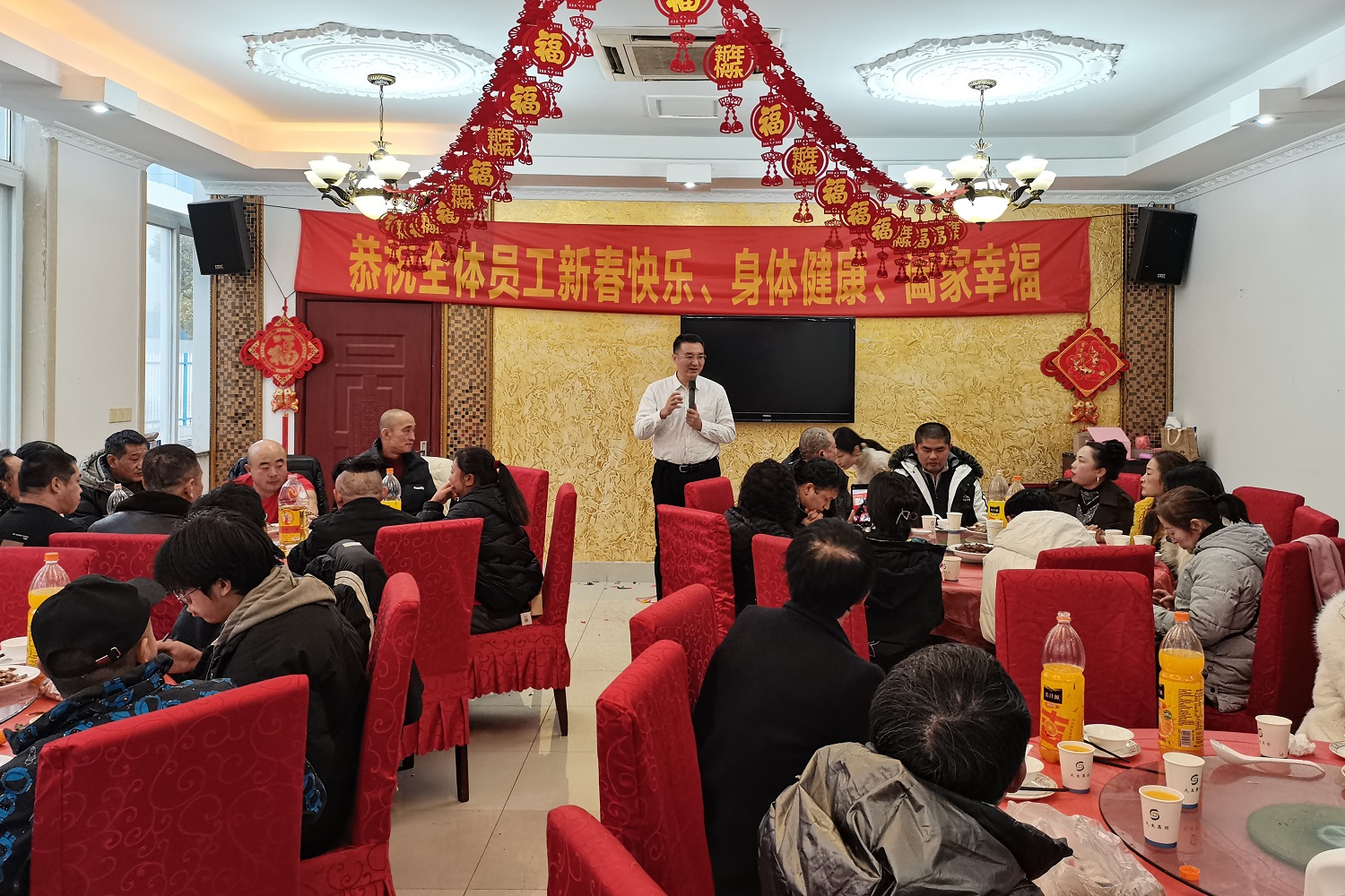 2月9日农历除夕晚,新区食堂餐厅里张灯结彩、热闹非凡,集团公司党委书记、董事长漆颖斌,党委副书记、工会主席盛燕兵与节前坚守生产岗位、未能回家过年的50余名外来务工人员一起吃年夜饭,共迎甲辰龙年,人间烟火让留厂过年的职工感受到“他乡亦故乡”的温暖。 集团领导和员工围桌而坐,畅叙衷肠,共话新春。漆颖斌与大家分享2023年太阳集团取得的优异成绩,他代表集团公司感谢大家一年来为公司的发展作出的贡献,并致以节日问候和新春祝福。他祝愿大家以及家人新年快乐、身体健康、万事如意。 年夜饭现场,漆颖斌与员工亲切交流,举杯共饮,一起游戏。热气腾腾的饭菜和大家的欢声笑语交织在一起,变成冬日中最温馨的时刻。美味可口、营养丰富、具有南通地方特色的年夜饭,将家的烟火气息和公司的温心关怀送到了员工心坎上。集团公司人力资源部在精心准备年夜饭的同时,还安排了趣味十足的游戏与抽奖活动,为年夜饭增添了节日喜庆与浓浓年味。