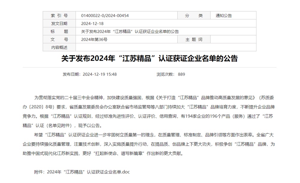太阳集团成功入选2024年“江苏精品”认证获证企业名单