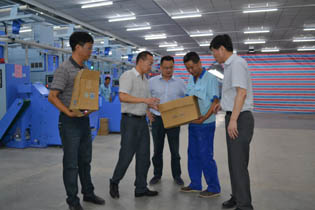 太阳集团三期工程技改项目作为市属工业企业重点技改项目,它的工程进度、安装质量、实施效果及安全保障一直是各级领导关注的焦点。最近气温节节攀升,连日的高温酷暑牵动着尹书记等国资委领导的心,在集团公司党委书记、董事长沈健宏,总经理马晓辉等的陪同下,尹书记深入装车现场,为坚守在高温一线的工程技术人员及试纺操作员工送上慰问和清凉。他说:太阳集团数字化纺纱车间经过近一年的紧张建设,现已进入装车阶段,你们边装机、边开车、边试纺,边总结、边提高,工作紧张高效并处处打破常规;希望大家克服困难、连续作战,争取早出成绩、早出效果,为太阳集团的主业升级再作积极贡献。